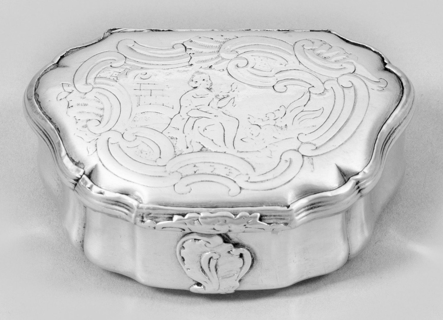 Silber. Passig geschweifte Kartuschenform. Wandung gegliedert von vertikalen Zügen und schauseitig verziert mit reliefplastischer Rocaille unter volutiertem Drücker. Auf flachem Scharnierdeckel gravierte Darstellung einer sitzenden Frau, gerahmt von Rocaillen und C-Schwüngen. Innen vergoldet. Minim. besch.; Teilw. undeutlich gest., wohl zweifaches Meisterzeichen mit Dat. für Andreas Borris (tätig ab ca. 1729). Gew. ca. 60 g. H. 2,4 cm. 6,8 cm x 4,5 cm.