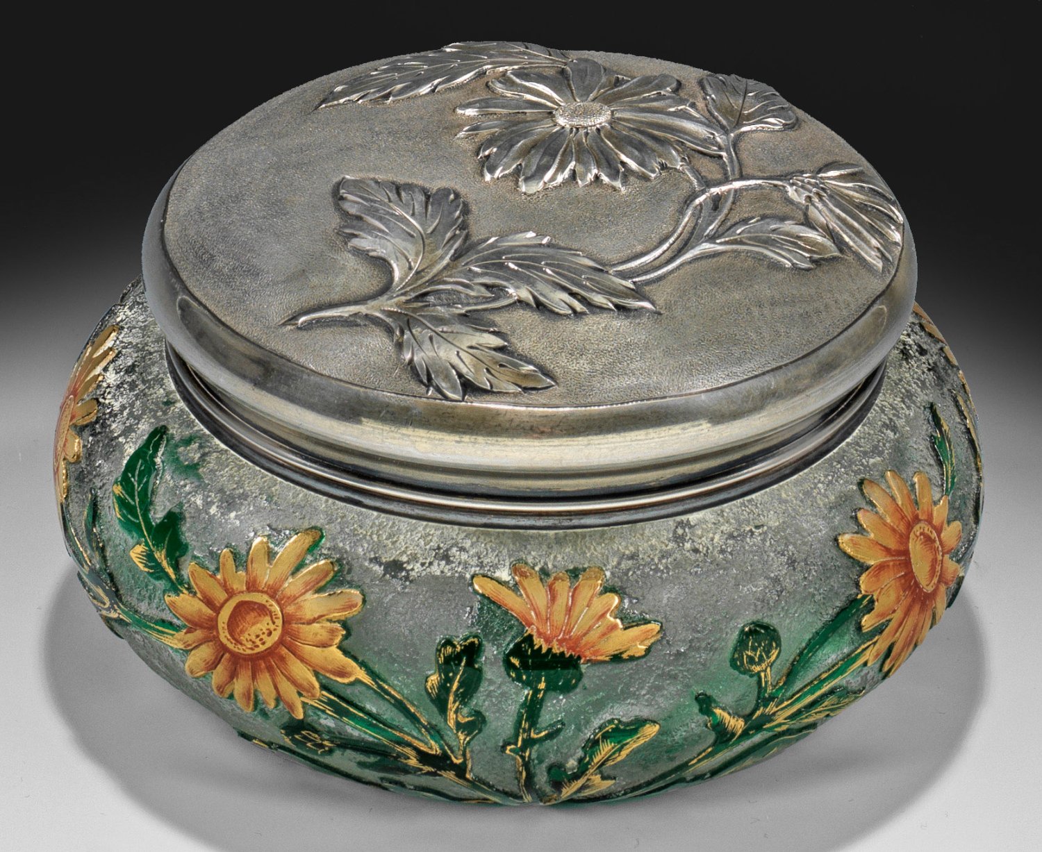 Runde, kugelig gedrückte Form. Farbloses Glas. Chrysanthemendekor, geätzt sowie in Kombination mit Email- und Goldmalerei, eisglasartiger Grund. Der flache, leicht gewölbte, innen vergoldete Silberdeckel mit korrespondierendem, getriebenem Chrysanthemenstängel. Sign. "Daum Nancy" mit Lothringer Kreuz in Gold. Montierung und Deckel mit französischem Silber-Garantiestempel (Minervakopf) für 950er-Silber; Herstellerzeichen "JM" mit Doppelhammer und zwei Sternen von Joseph Alexandre Martel, Paris (tätig 1888-1914). D. 12 cm.
