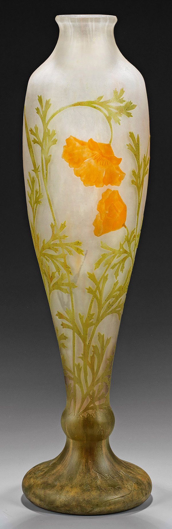 Schlanke Form. Auf ausgestelltem, gewölbten Fuß keulenförmiger Korpus, gerundete Schulter, in den Hals mit auslippender Mündung einschwingend. Überfangglas, farblos und mit flockigen Pulvereinschmelzungen in Weiß und Gelb, die Außenschicht mit Pulveraufschmelzungen in Grün und Ocker sowie partiellen Auflagen (sog. Marqueterie de verre) in Orangerot. In mehreren Arbeitsgängen geätzter und geschnittener Dekor aus blühendem Kalifornischem Mohn (Eschscholzia californica, auch Goldmohn genannt). Geschnittene Sign. "DAUM NANCY", Lothringer Kreuz. H. 49,3 cm.