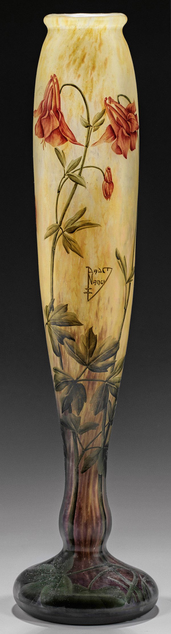 Hohe, schlanke Keulenform auf ausgestelltem, gebauchtem Fuß. Überfangglas, farblos sowie mit gelben und violetten Pulvereinschmelzungen. Dekor aus blühenden Akeleistängeln in polychromer Emailmalerei. Sign. "DAUM NANCY" in Verbindung mit Lothringer Kreuz. H. 39 cm.