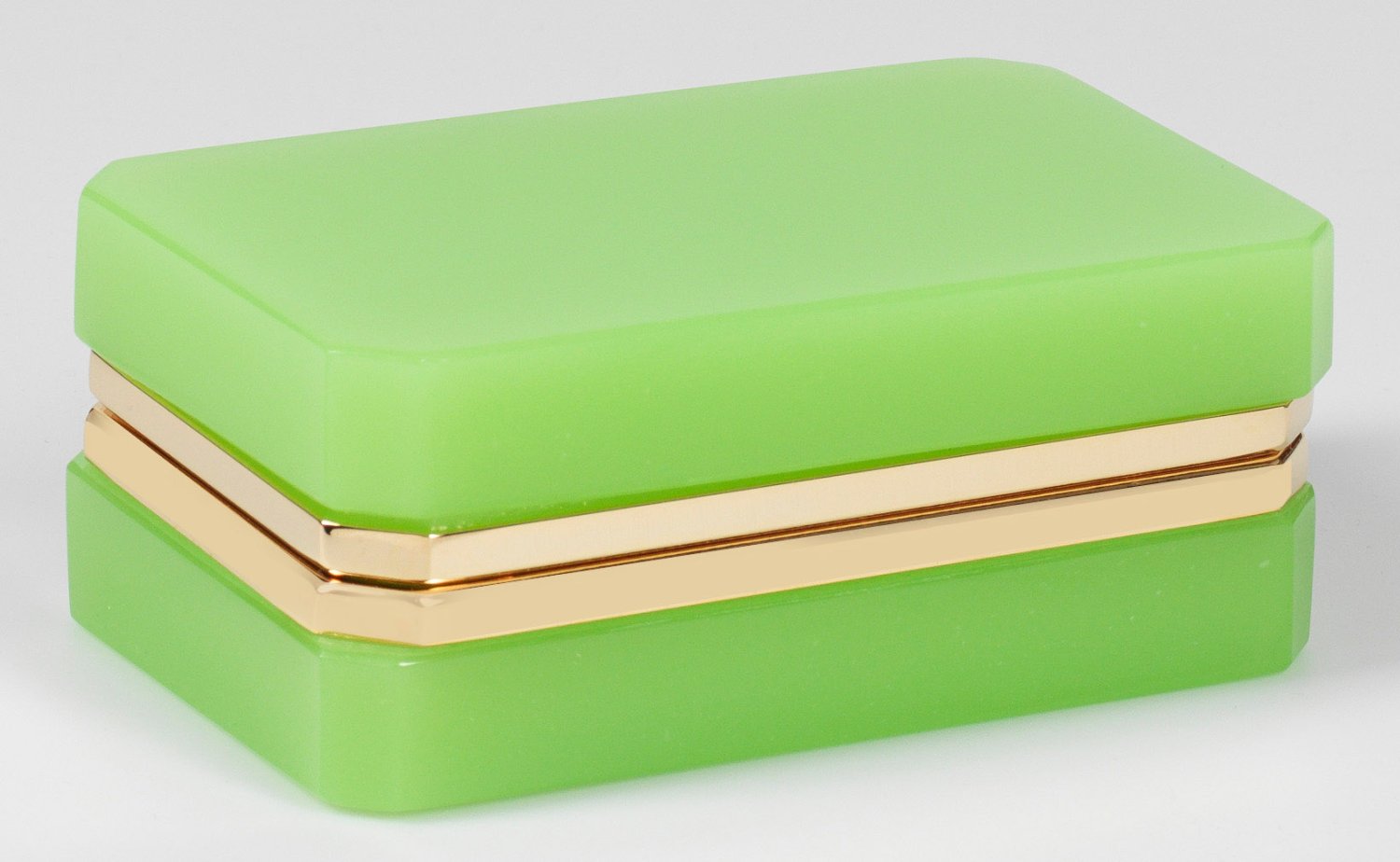 Flache, rechteckige Form mit abgeschrägten Ecken. Geschliffenes und poliertes, hellgrünes, opakes Glas. Scharnierte Messingmontierung. H. 5,5 cm, 13,2 cm x 8,5 cm.