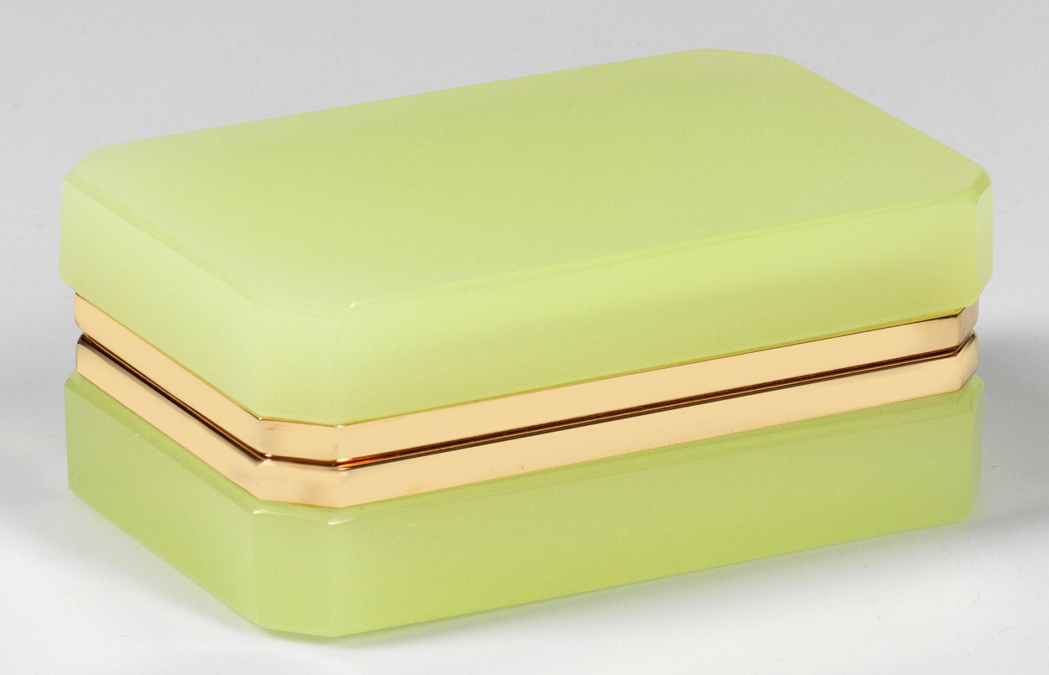 Flache, rechteckige Form mit abgeschrägten Ecken. Geschliffenes und poliertes, limonengrünes bzw. limettengrünes, opakes Glas. Scharnierte Messingmontierung. H. 5,6 cm, 13,3 cm x 8,6 cm.