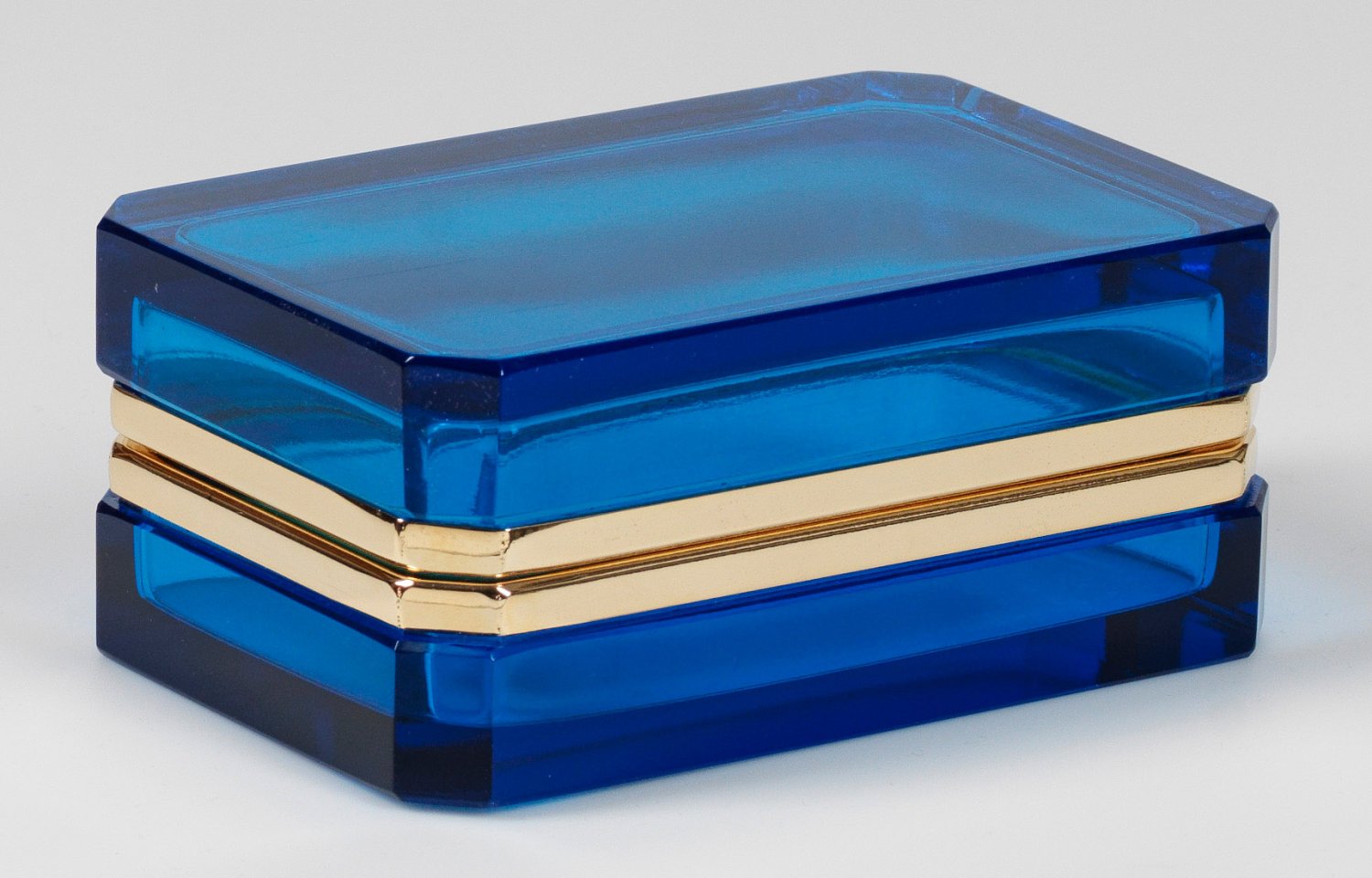 A French Art Deco cut and polished dark blue glass box with brass-mounted hinged cover.