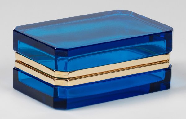 Flache, rechteckige Form, abgeschrägte Ecken. Geschliffenes und poliertes, dunkelblaues, transparentes Glas. Scharnierte Messingmontierung. H. 5,8 cm, 13,2 cm x 8,6 cm.