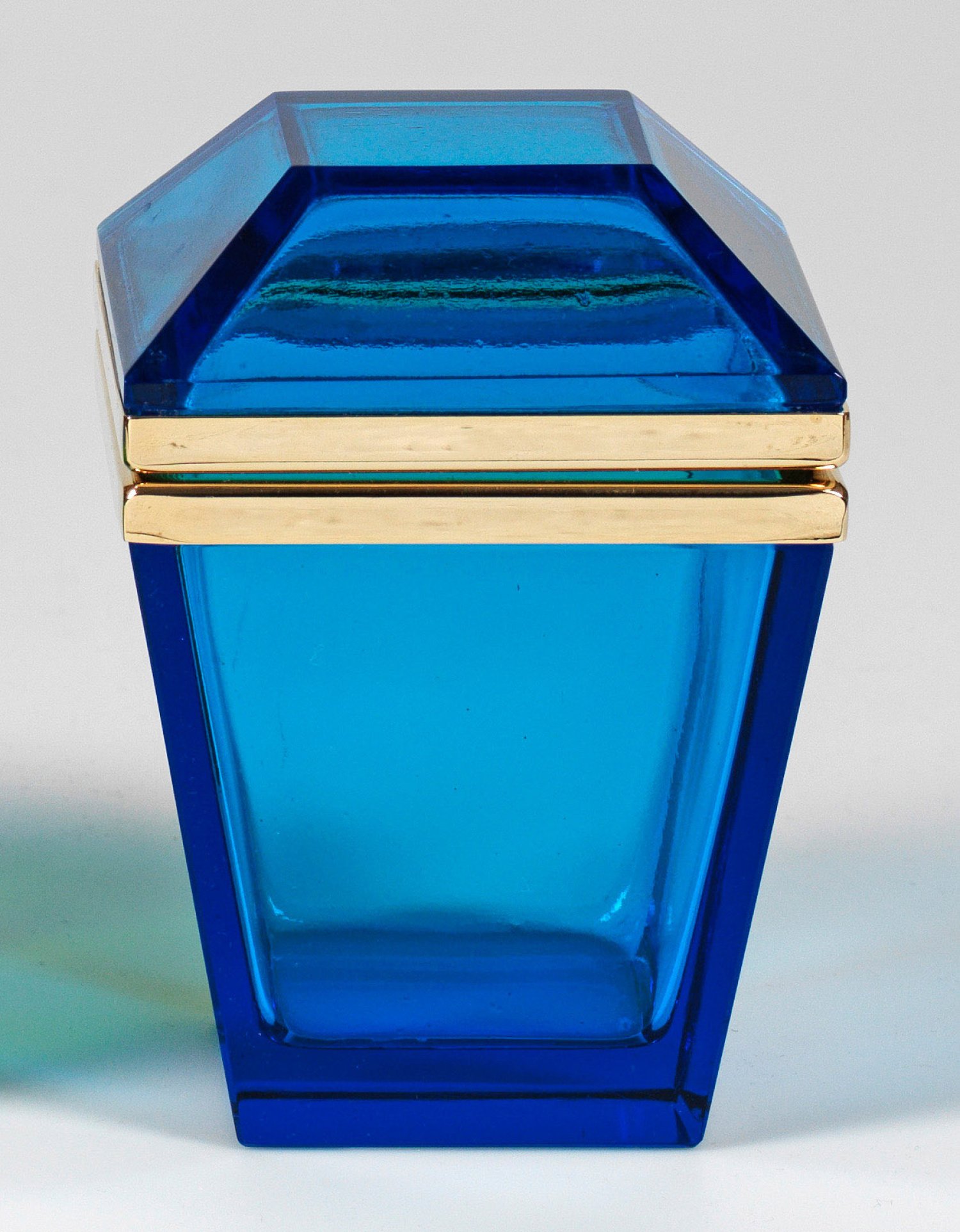 A diamond-shaped French Art Deco cut and polished dark blue glass box with brass-mounted hinged cover.