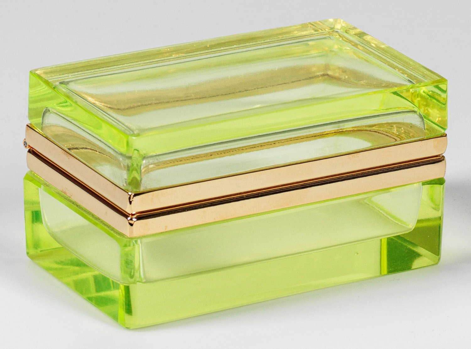 Rechteckige Quaderform. Geschliffenes und poliertes, gelbes, transparentes Uranglas. Scharnierte Messingmontierung. H. 6 cm, 10,8 cm x 6,5 cm.