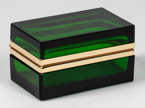 Rechteckige Quaderform. Geschliffenes und poliertes, dunkelgrünes bzw. smaragdgrünes, transparentes Glas. Scharnierte Messingmontierung. H. 6 cm, 10,8 cm x 6,5 cm.