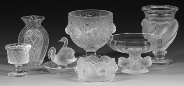 Farbloses Kristallglas, in die Form geblasen, teilw. satiniert, geschliffen und poliert. Bestehend aus Vase "Elisabeth", Vase "Ermenonville", Entw. Marc Lalique; Fußschale "Nogent" und Zierschale oder Ringhalter "Deux cygnes", Entw. Marc Lalique 1954-1966; Schale "Gao", Entw. René Lalique um 1934; Vase "Pavie", Entw. Marie-Claude Lalique 1989; gefußter Kerzenhalter oder Vase. Schale "Nogent" und Vase "Pavie", am Rand best. Jeweils gem.; H. 4,8 cm-14,7 cm.
