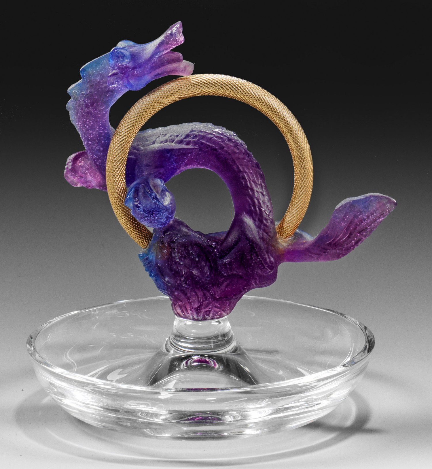 Runde, leicht gemuldete, mittig hochschwingende Schale aus farblosem Kristallglas, darauf montiert eine vollplastische Drachenfigur aus violettem Pâte-de-cristal (Pâte-de-verre) mit vergoldetem Bronze- oder Messingring. Sign. "Daum France". H. 15 cm.