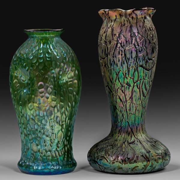 Two iridescent Bohemian Art Nouveau glass vases including a Loetz vase with "Creta Diaspora" decor.