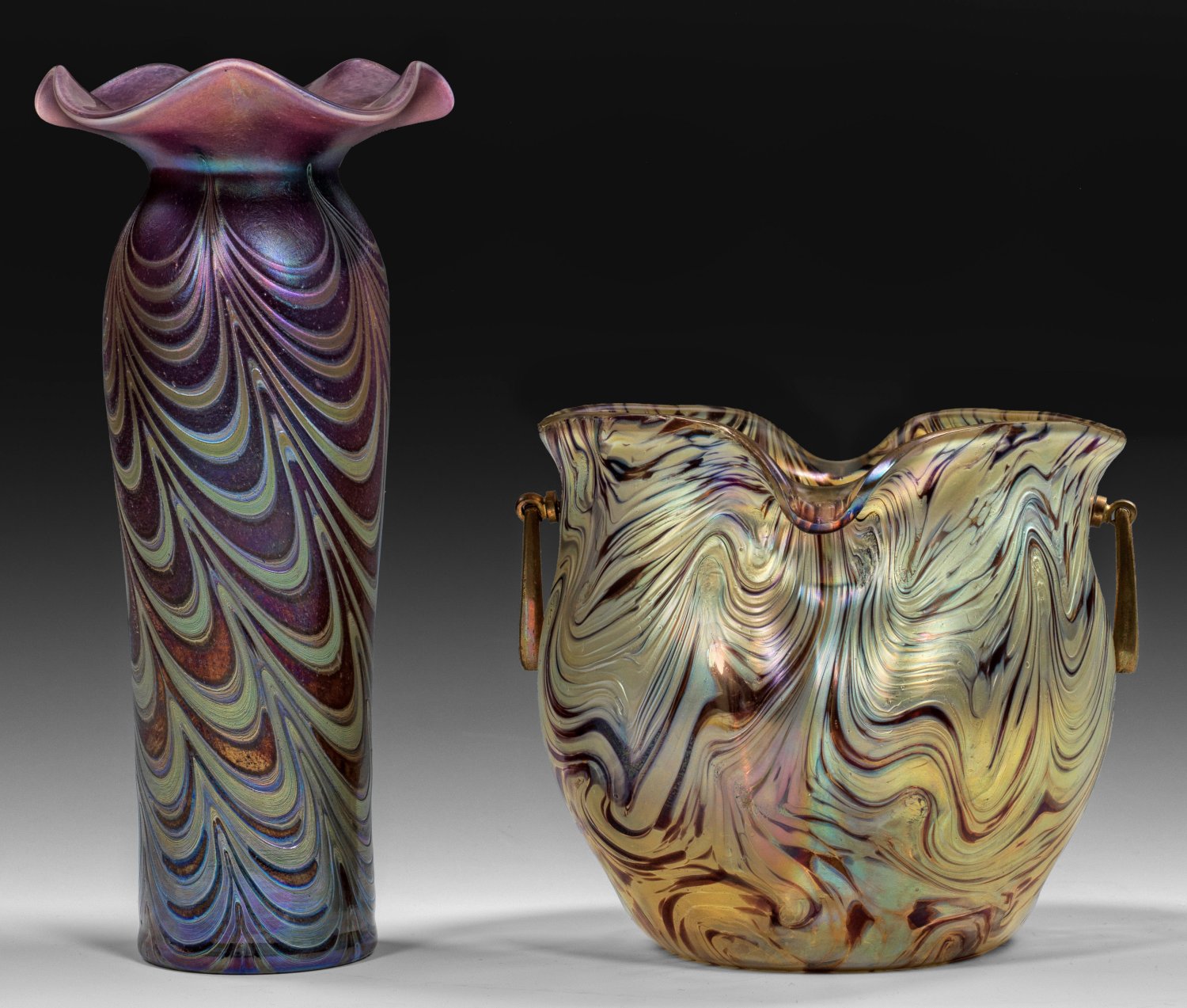 Gebauchte, vierpassige, leicht ins Oval gedrückte Vase mit zwei seitlichen, frei beweglichen Metallhenkeln; schlanke Vase mit kragenartig ausgestellter, fünfpassiger Mündung. Farbloses und violettes, teilw. leicht opaleszierendes Glas mit eingeschmolzenen, verzogenen, violetten und silbergelben Fäden, reduziert und irisiert. Schlanke Vase undeutl. monogr. u. dat. (19)94. 14,5 cm-24,8 cm.