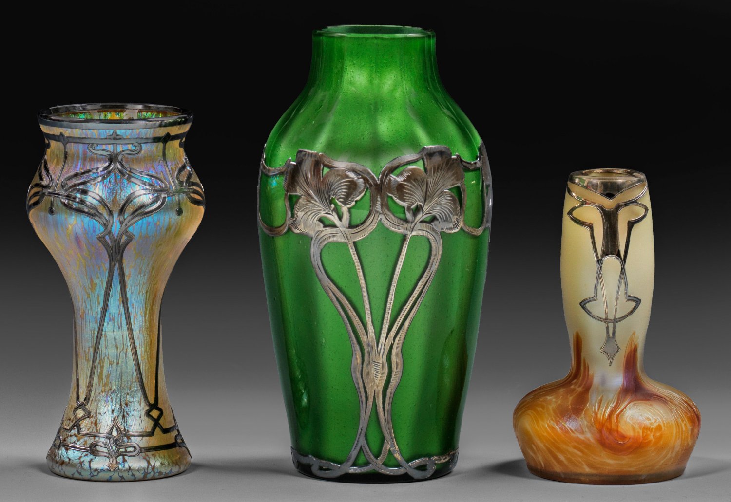 Lot 432: Drei Jugendstil-Glasvasen mit Feinsilberauflage