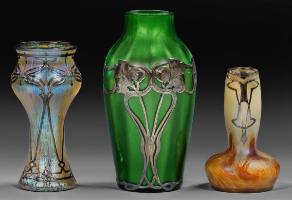 Farbloses und opaleszierendes Glas mit eingeschmolzenen Silbergelbkröseln bzw. opalesierendes, reduziertes und irisiertes Glas mit grünem Überfang. Galvanischer Silberauflagedekor aus Ornamenten bzw. stilisierten Schwertlilien. H. 11,5 cm-17 cm.