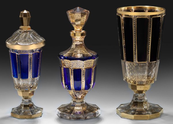Farbloses Kristallglas mit Facettenschälschliff sowie hochgeschliffenen, dunkelblauen und dunkelvioletten Feldern. Flächendeckender Dekor in Goldmalerei und opulenter Vergoldung. H. 28 cm-29 cm.
