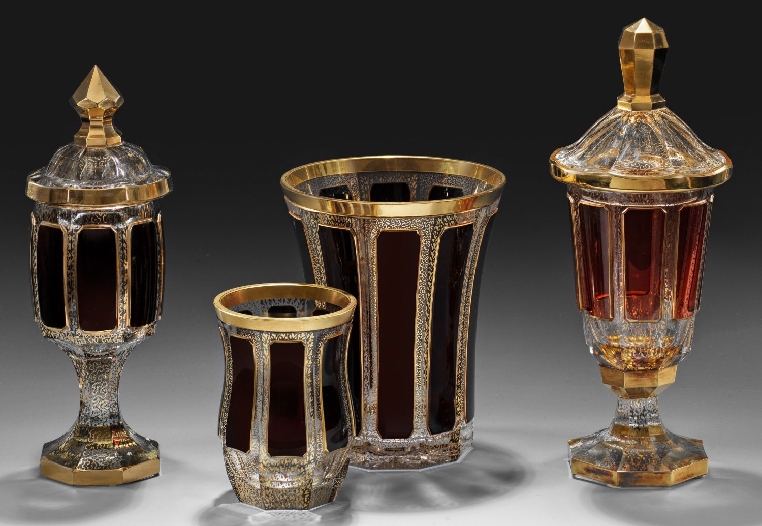 Farbloses Kristallglas mit Facettenschälschliff sowie hochgeschliffenen, dunkelrubinroten und rosafarbenen Feldern. Flächendeckender Dekor in Goldmalerei und opulenter Vergoldung. H. 12 cm-27,5 cm.
