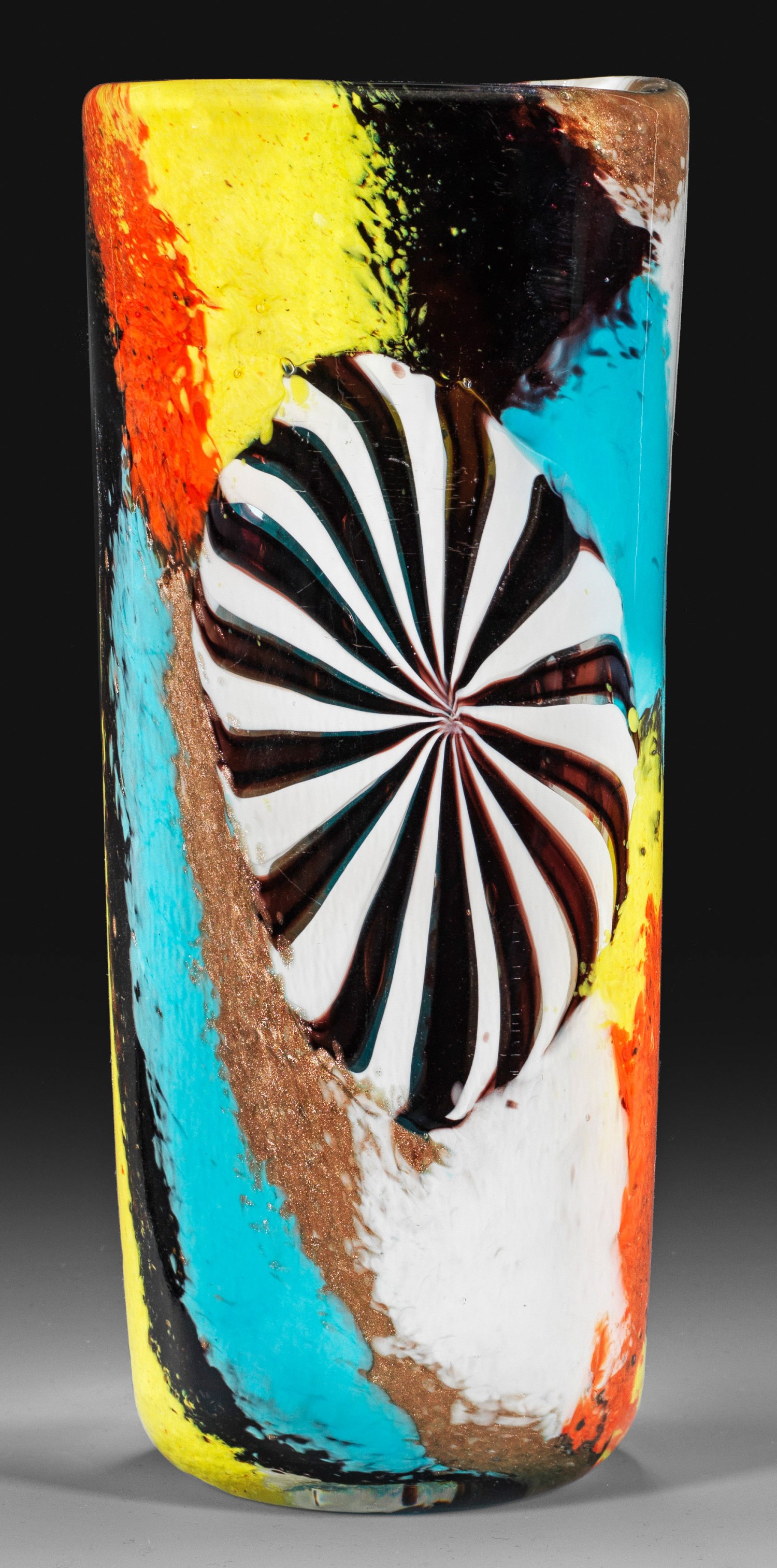 Hohe, schlanke Becherform, oberhalb vierseitig quadratisch abgeplattet. Farbloses Überfangglas mit polychromen Pulvereinschmelzungen bzw. Plättchen in Rot, Schwarz, Weiß, Gelb, Orangerot, Hellblau (Türkisblau), Aubergine und Aventurin sowie einer großen Sternmurrine. Entw. Dino Martens für Aureliano Toso. H. 32,8 cm.