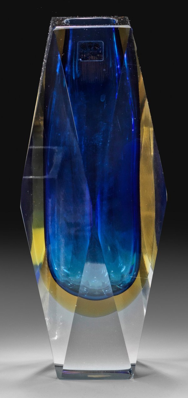 Schlanke, mittig hexagonal geschliffene und polierte Vase mit quadratischem Fuß und Lippenrand. Dickwandiges "Sommerso"-Überfangglas, farblos, goldgelb und dunkelblau. Golden-schwarzes Etikett der Fa. Ebeling & Reuss ("Golden crown E & R ITALY" mit Krone, "1886" u. Bez. "GENUINE CRYSTAL HANDCUT LEAD"). H. 30,5 cm.