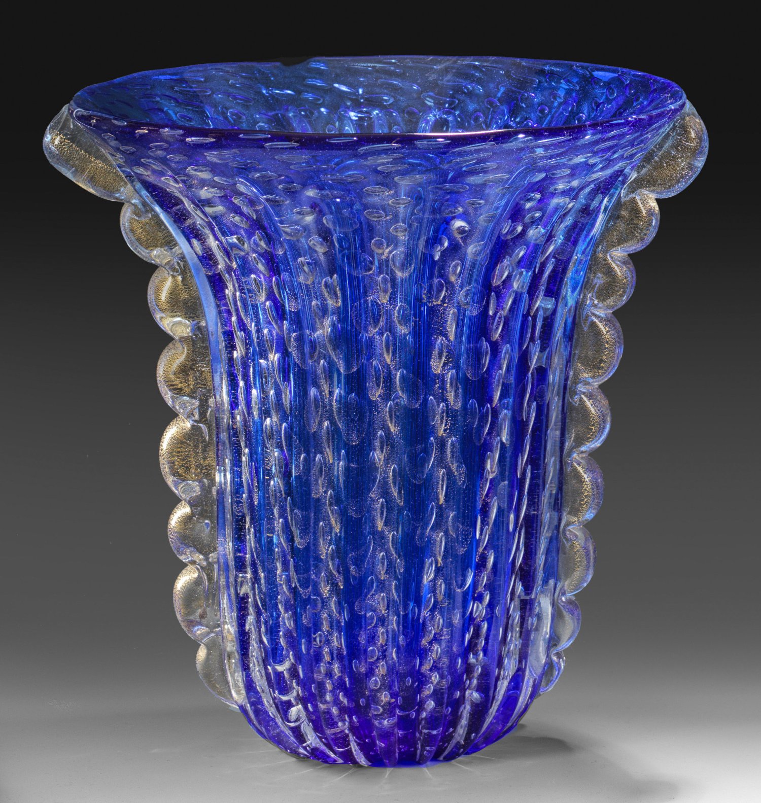 Gerippte Glockenform, seitlich zwei vertikale, lange, gewellt gekniffene Applikationen. Farbloses und dunkelblaues Glas mit Luftblasendekor und Einschmelzungen aus fein zersprengter Goldfolie. Sign. "TOSO MURANO". H. 31,8 cm.