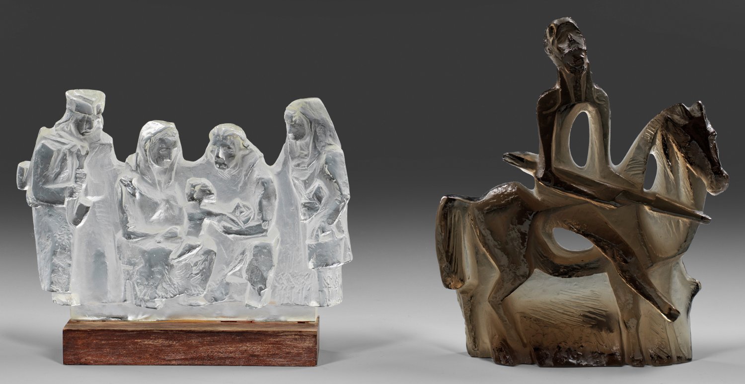 Anbetung der Hirten mit Walnusssockel und Don Quijote aus farblosem und rauchfarbenem Glas, formgeschmolzen, durch Schliff und Politur überarbeitet. Wohl Unikate. Jeweils sign. "Prof. Jan Cerný. H. 14,5 cm-19 cm.