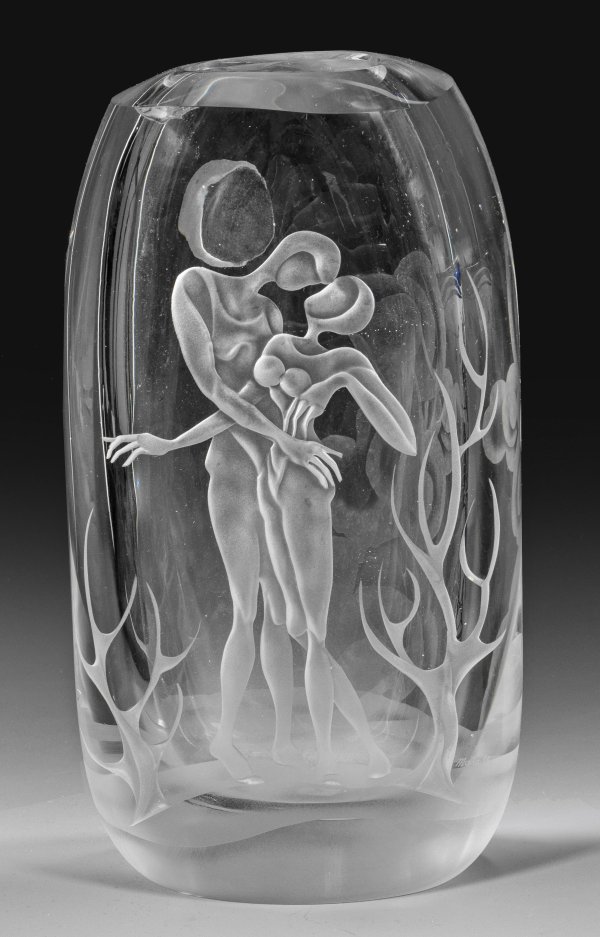 Unikat. Hochovale, beidseitig abgeplattete Vase, geschliffen und poliert. Dickwandiges Kristallglas. Dekor geschnitten bzw. in Sandstrahltechnik ausgeführt. Schauseitig ein sich umarmendes, stehendes Liebespaar, rücks. ein Wolkenhimmel mit Halbmond. Sign. u. dat. "MaKa(19)80". H. 29 cm.