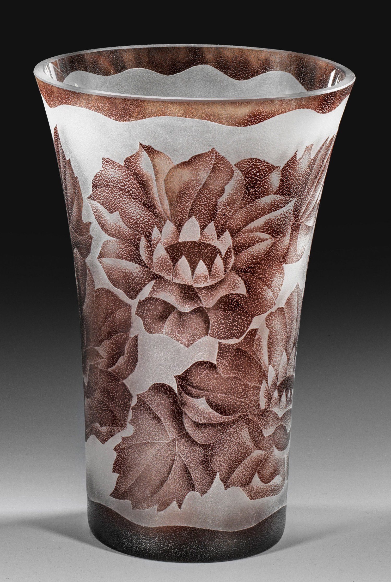 Unikat. Hohe, leicht ausschwingende Becherform. Farbloses Glas, dünne, violette Pulveraufschmelzungen. Dekor in Ätz- oder Sandstrahltechnik. Sign. u. dat. "MaKa(19)82". Unterhalb Etikett mit handschriftlicher Bez. "Unikat MaKa". H. 26,2 cm.