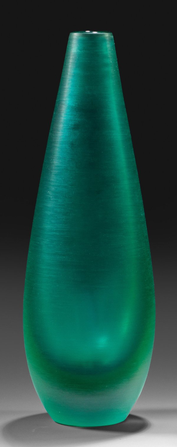 Schlanke Kolbenform. "Sommerso"-Überfangglas, farblos, türkisgrün und hellgrün. Außenwandung mit flächendeckendem, mattem "Inciso"-Liniengravurdekor. Entw. Paolo Venini, 1956. Sign. u. dat. "venini 1998/14", Firmen-Etikett. H. 31,5 cm.