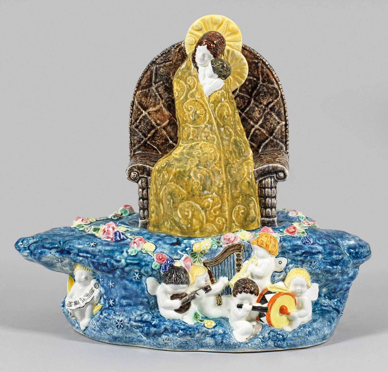 Steingut. Reliefplastische Figurengruppe. Thronende Madonna in einem langen, goldgelben Mantel, das Kind herzend. Der von Sternen, dem Stern von Bethlehem und einer Blumengirlande belegte Wolkensockel mit sechs musizierenden Engeln. Seltene Farbvariante der bedeutenden Keramikgruppe mit überaus reicher, polychromer Bemalung. Entw. Anton Klieber, 1916. Rücks. bez. "ANTON KLIEBER", dat. 1916 und undeutliche Nummer; Firmenmarke (Dreiecksmarke) mit Bez. "MADE IN AUSTRIA". H. 25,3 cm; B. 29 cm.