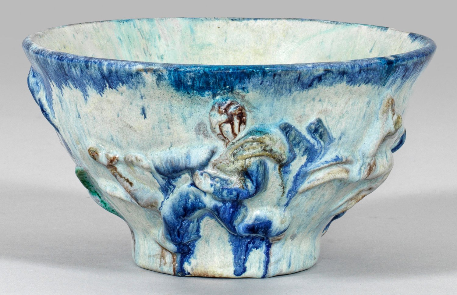 Irdenware. Glockenform, umlaufender, stilisierter Reliefdekor aus Figuren und Rehen. Hellgraue Glasur mit polychromer Bemalung. Rest.; Entw. Hilde Heger, 1925-1928. Firmen-Pressmarken sowie "MADE IN AUSTRIA" (im Rechteck). H. 10,5 cm; D. 19,3 cm.