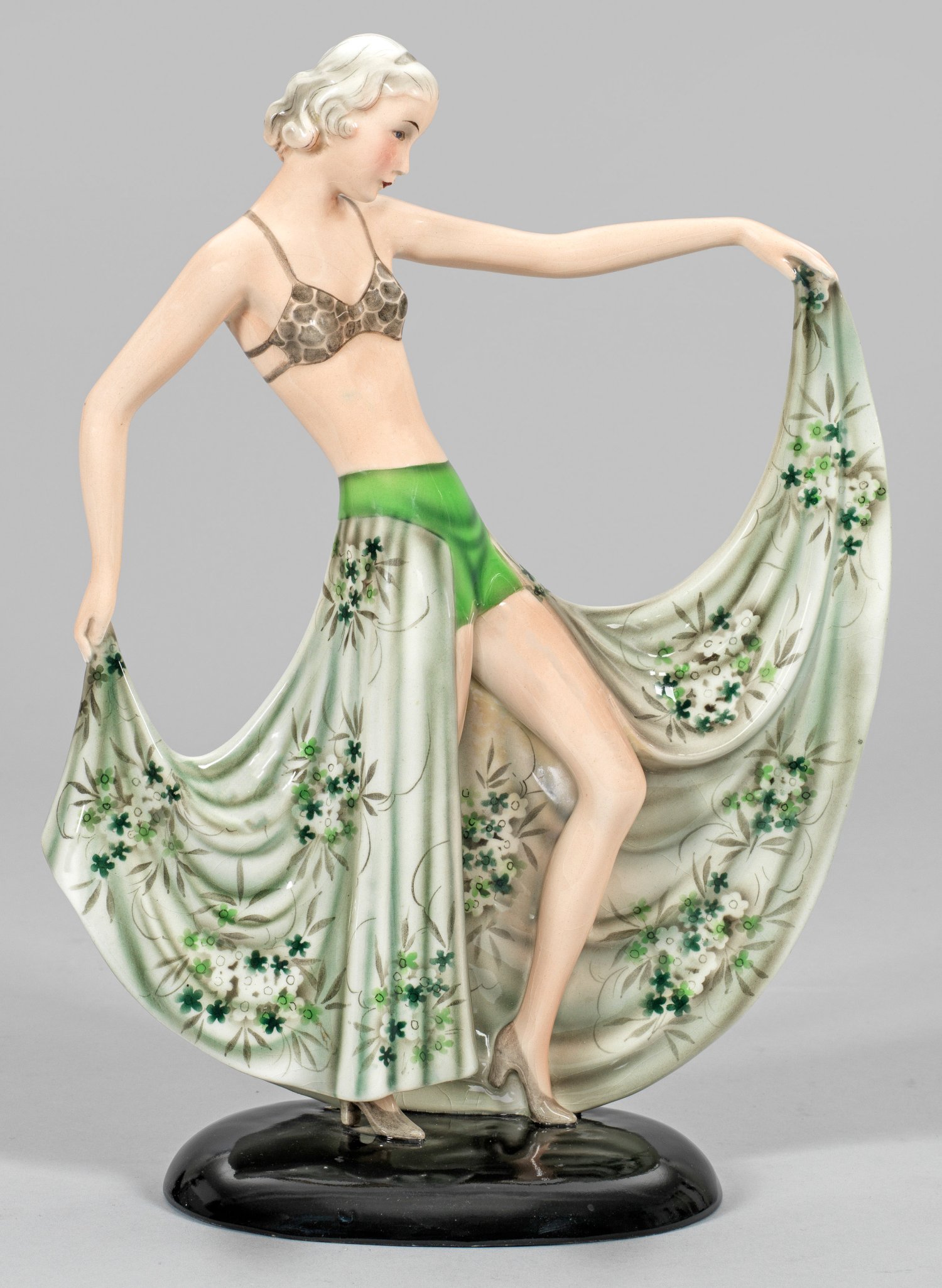 Steingut. Auf einem ovalen Sockel stehende junge Tänzerin im Bikini mit Leopardenmuster und langem, in seitlicher Pose angehobenem Rock mit Blumendessin. Polychrome Unterglasurbemalung. Modell-Nr. 8127F, Entw. Stephan Dakon, um 1937. Manufakturmarke mit Bez. "MADE IN GERMANY". H. 38 cm.