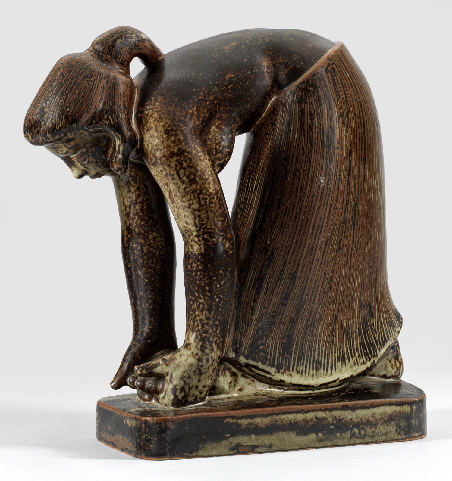 Steinzeug mit nuancierter Sung-Glasur in braunen und grauen Tönen. Vollplastische, modern stilisierte Figur eines sich hinunterbückenden Mädchens beim Waschen ihrer Füße, ihr Rock und ihre Haare mit feinen Linienstrukturen in der Glasur. Sign. "Johannes Hedegaard", Manufakturmarke, undeutl. Modell-Nr., nummeriert 1/3. H. 43 cm.