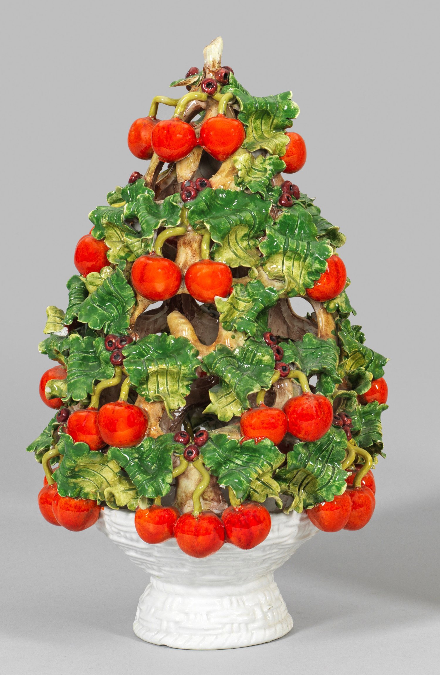 Fayence bzw. Majolika. Plastisch gestalteter Korb, in dem sich durchbrochen gearbeitete Kirschzweige mit leuchtend roten Früchten auftürmen. Polychrom bemalt. Ger. best.; Am Boden gem. "BASSANO". H. 40 cm.