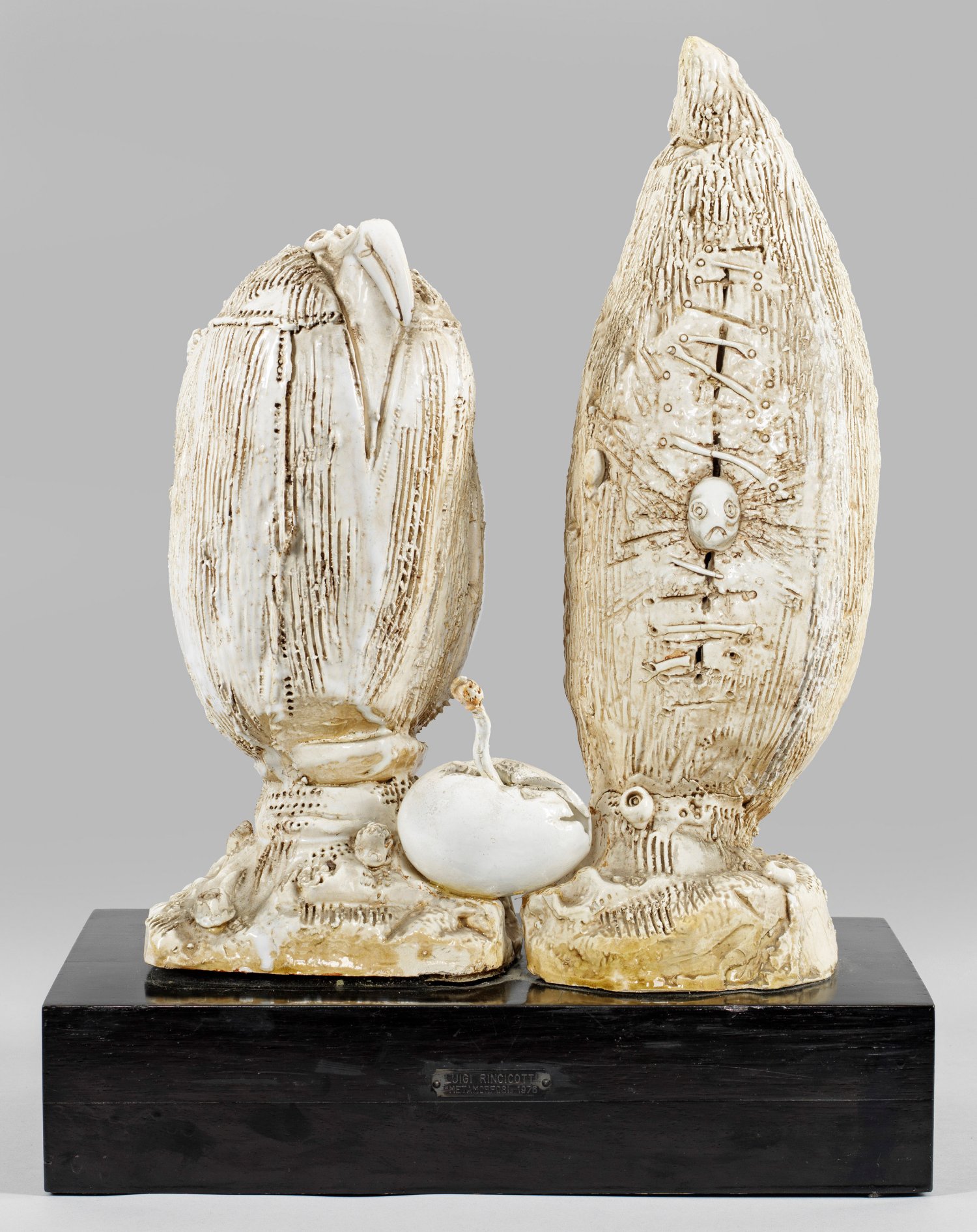 3-tlg., montierte, weiß glasierte, surrealistische Keramikgruppe auf ebonisiertem Holzsockel, 1976. Sign. u. nummeriert 36/100; schauseitig auf montierter Metallplakette bez., betitelt u. dat.; Ges.-H. 43,5 cm.