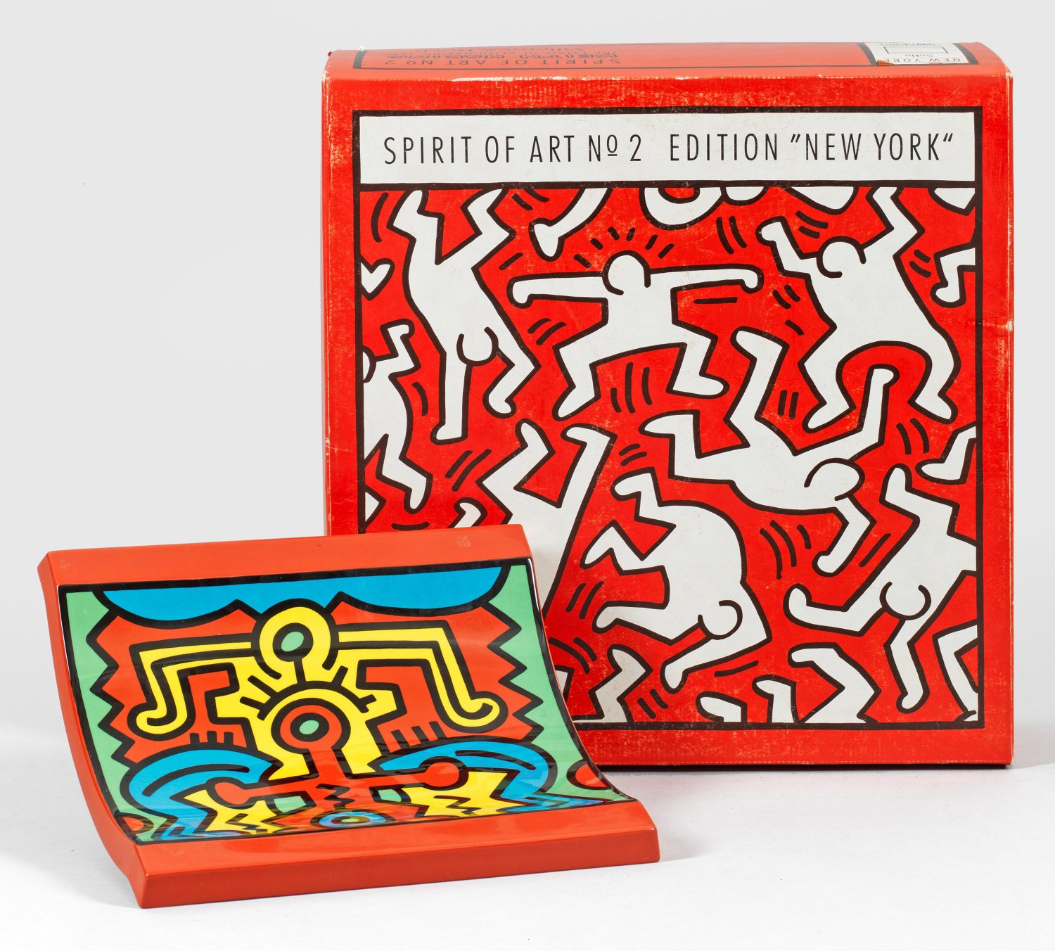 Rechteckige, gemuldete Schale als Tafelaufsatz oder Wandplatte. Farblos glasierte Keramik mit polychromem Dekor. Nr. 144 der limitierten Edition vom 750 Exemplaren. Unterseitig schablonierte oder in Umdrucktechnik ausgeführte Sign. "K. Haring ®", sowie rechteckige Firmenmarke mit Bez. "No 2 SPIRIT OF ART NEW YORK - SoHo KEITH HARING THE ESTATE OF KEITH HARING © 1992 Villeroy & Boch GERMANY". 29,2 x 32 x 6 cm. Original-Karton.