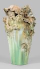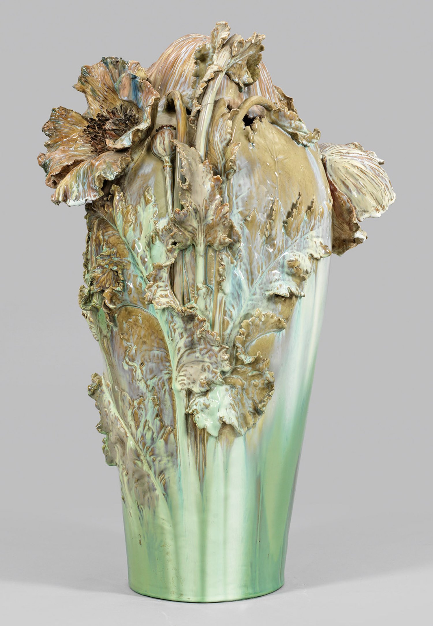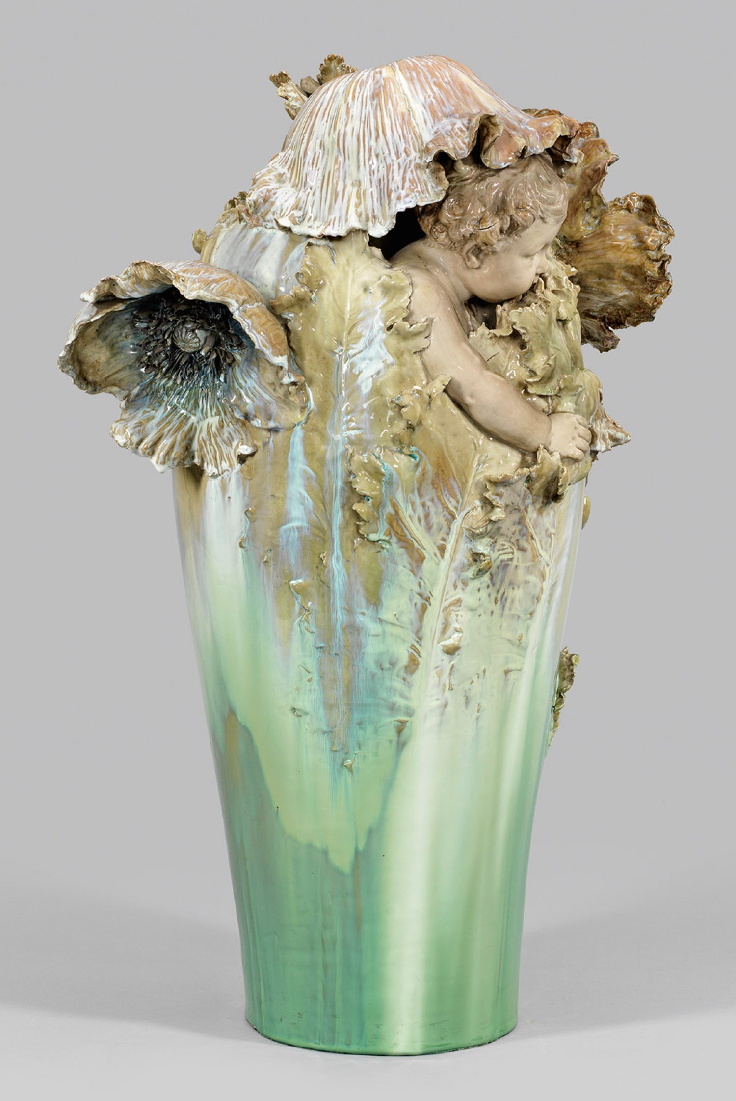 Porzellan mit allseitig in Mint- bis Türkisgrün- sowie Hellbraun changierender Laufglasur. Über glattem Rundstand mit kreisrundem Bodenloch keulenförmiger, sich erweiternder Korpus. Ausgehend von der unteren, glatten Wandung aufsteigender, flach bis stark reliefplastisch gearbeiteter, vegetabiler Dekor aus Stängeln und Blattstrukturen des Mohns, übergehend in freiplastische Blätter und große Mohnblüten. Seitlich, unter einem gesenkten, haubenförmig umgestülpten Kelchblatt hervortretender Kopf eines neugierig beobachtenden Kindes mit vollplastisch gearbeiteter Schulter, rechtem Arm und Händen, mit denen es sich am Blattwerk festhält. Modell-Entw. Richard Edmund Flöricke (tätig 1892 - 1942 in der KPM). Dekor-Entw. wohl Carl-Hans Bernewitz oder Franz Metzner. Modell-Nr. 6244 (Modellbucheintrag September 1899, bez. "Fische" (wohl irrtümlich für Modell-Nr. 6224 "Vase mit Fantasie Fischen"). Massebezeichnung Q XIII. Ein Stengel rep.; Verschwommene Zeptermarke. H. 73 cm.