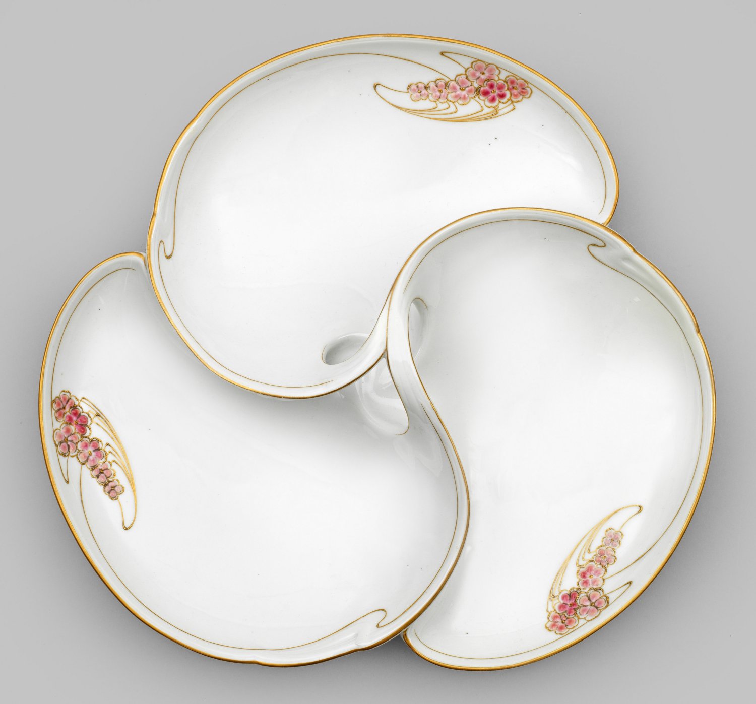 Dreifach gegliedertes, vertieftes Cabaret. Geschweifte Form, mittig hochgezogener, durchbrochen gearbeiteter Henkel. Feiner Jugendstildekor aus feinen, gezackten Reliefgoldlinien mit zarten, rosé- bis purpurfarbenen, erhabenen Emailblüten. Entw. Max Schröder, Modellbucheintrag Juni 1901. Dekormaler-Nr. für Carl Hübener (1890 - 1912). Jahreszeichen. Zepter- und Malereimarke. H. 7,5 cm. D. 30 cm.