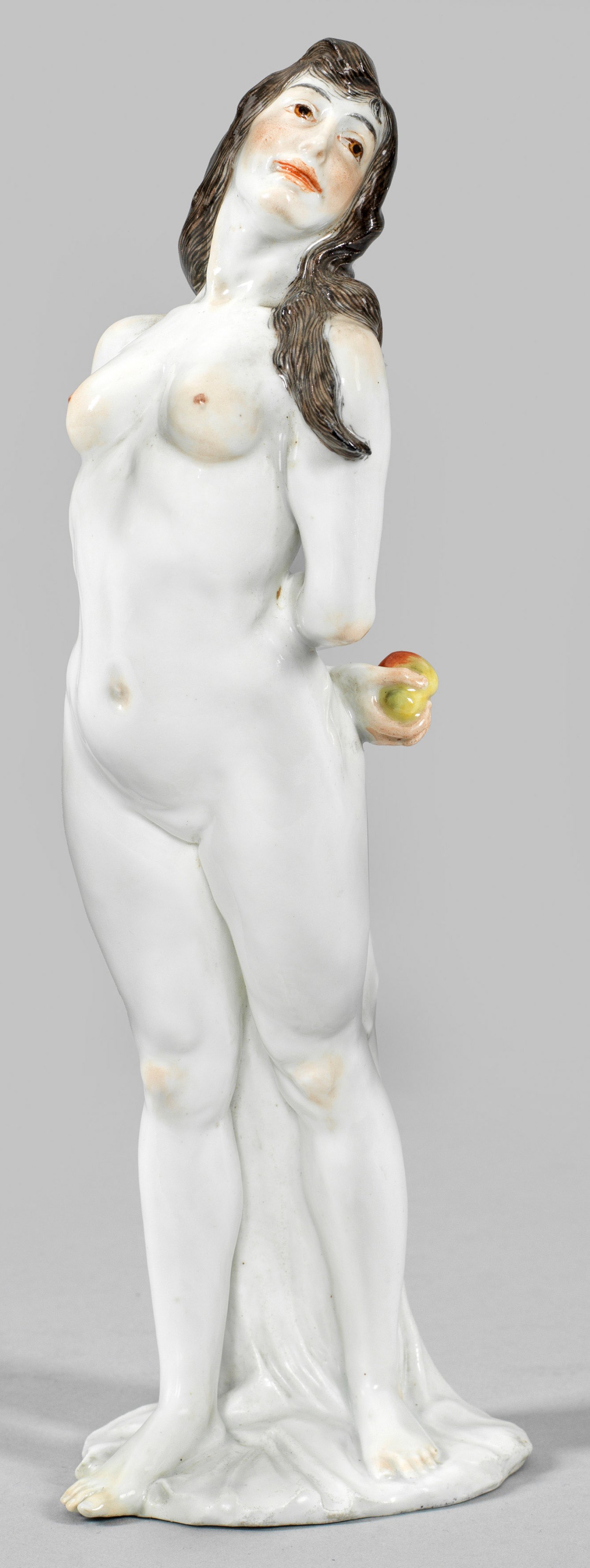Auf unregelmäßigem, niedrigen Sockel stehender, weiblicher Akt (wohl Eva) mit langen, braunen Haaren, den erhobenen Kopf nach links gewandt und die Arme hinter den Rücken verschränkt. In der rechten Hand einen Apfel, in der Linken ein zum Boden herabfallendes Tuch haltend. Polychrom akzentuierte Malerei. Entw. Martin Wiegand, um 1906 – 1909. Modell-Nr. Y 131. Minim. rest./best.; Schwertermarke. H. 26 cm.