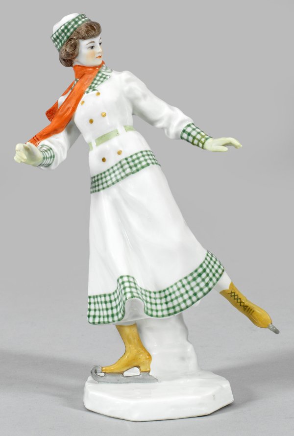 Auf einer eisschollenförmigen Plinthe eine junge, in schwungvoller Drehbewegung dargestellte Dame beim Eislaufen. Polychrome Malerei. Entw. Alfred König, um 1910 - 1911. Modell-Nr. Z 194. Unw. rest.; Schwertermarke. H. 21 cm.