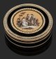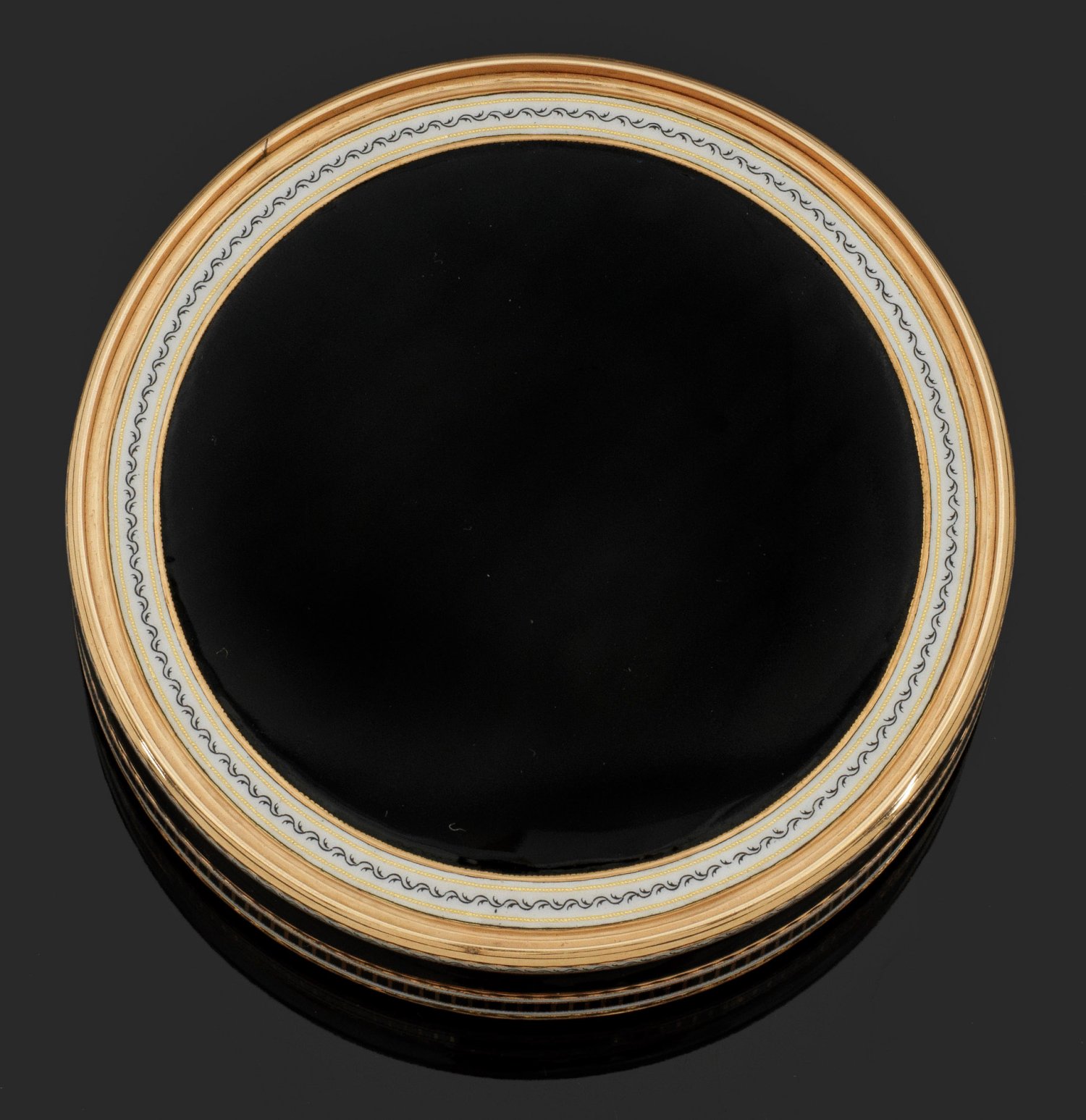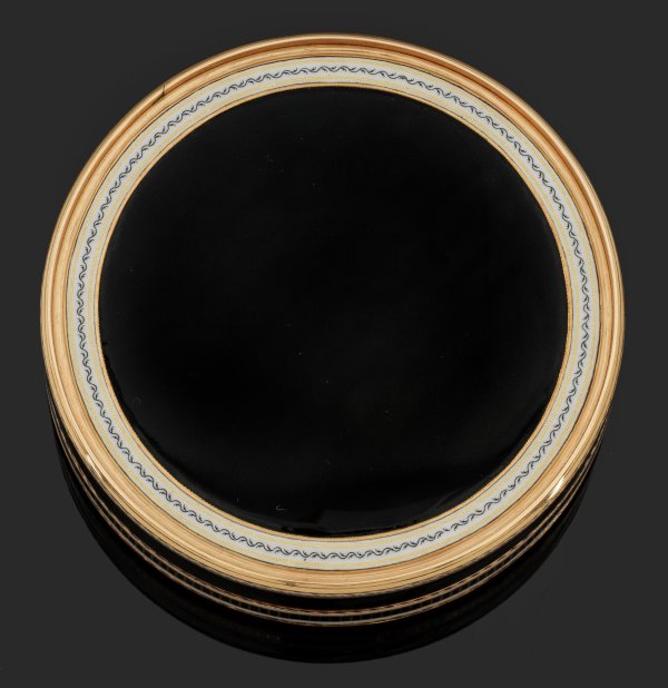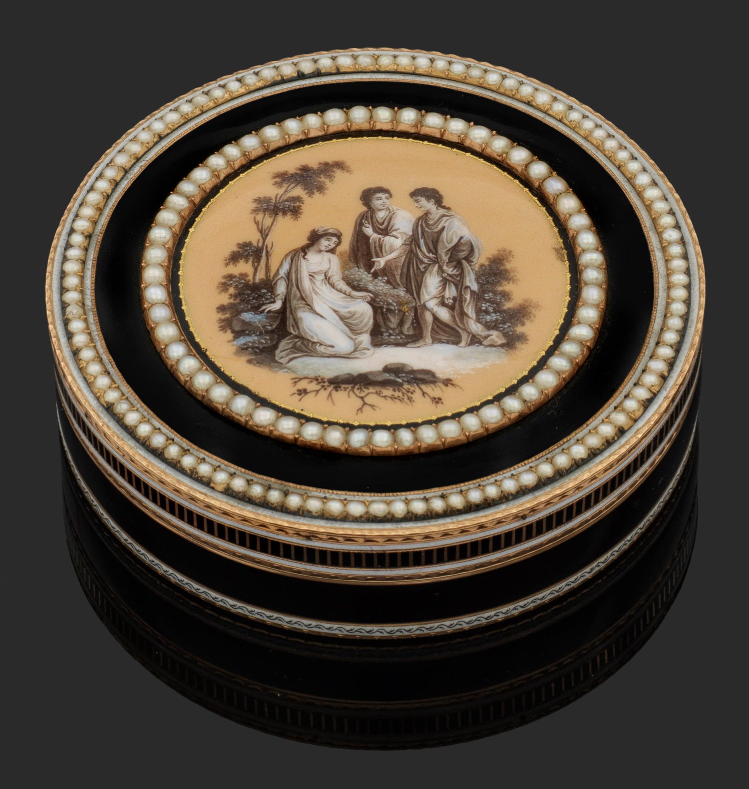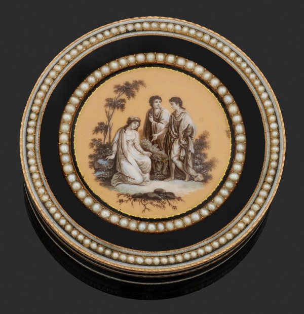 Rotgold. Zylindrischer Korpus. Deckel, Wandung und Boden mit linear guillochiertem, schwarz emailliertem Grund, umzogen von goldenen, geflammten sowie weißen, opaken Zierlinien mit Blattfries. Der Deckel gerahmt von zwei konzentrisch angeordneten, mit zart rosafarben changierenden Perlen ausgefassten Bändern. Zentrales Rundmedaillon mit szenischer, antikisierter Darstellung vor bewaldeter Landschaft in zarter Emaille-Grisaillemalerei über irisierend beigefarbenem Fond. Teilw. undeutlich gest., Beschauzeichen in der Art des Pariser Pächters Julien Alaterre. Gew. ca. 190 g. H. 2,1 cm. D. 8 cm.