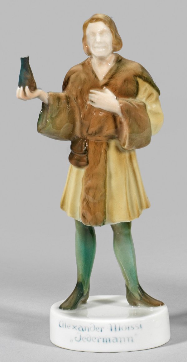 Vollplastische Darstellung des Alexander Moissi (1880-1935), Schauspieler am Deutschen Theater Berlin in der Rolle als "Jedermann" in pelzgefüttertem Mantel. Polychrome Unterglasurmalerei. Entw. Thekla Harth, 1913. Entw.-Bez. "Th. Harth". Modell-Nr. K 272. Manufakturmarke. H. 21 cm.