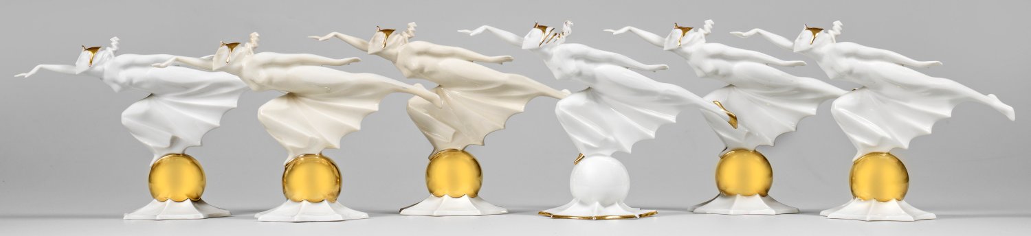 Weißporzellan, goldstaffiert. Über sternförmigem, achtfach eingezogenem Sockel, auf einer Kugel stehende, vollplastisch gearbeitete, dynamisch bewegte, weibliche Figur, sog. "Zeitgeist" (Originaltitel) in horizontal gestreckter, nahezu schwebender Haltung mit ausgreifender Schrittstellung. Entw. Karl Tutter, 1926. Entw.-Sign. "K. Tutter". (Modell-Nr. 539). Teilw. unw. rest./best.; Manufakturmarke. H. 14,5 cm. L. 21 cm.