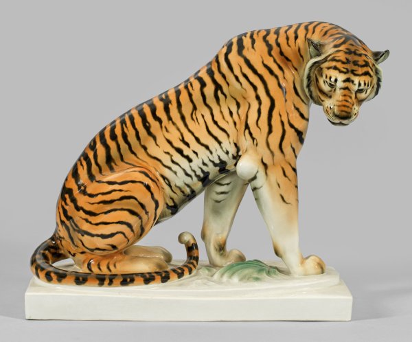A large Thuringian Art Deco porcelain figure of a sitting tiger. Minor hairline crack. Manufacturer's mark.