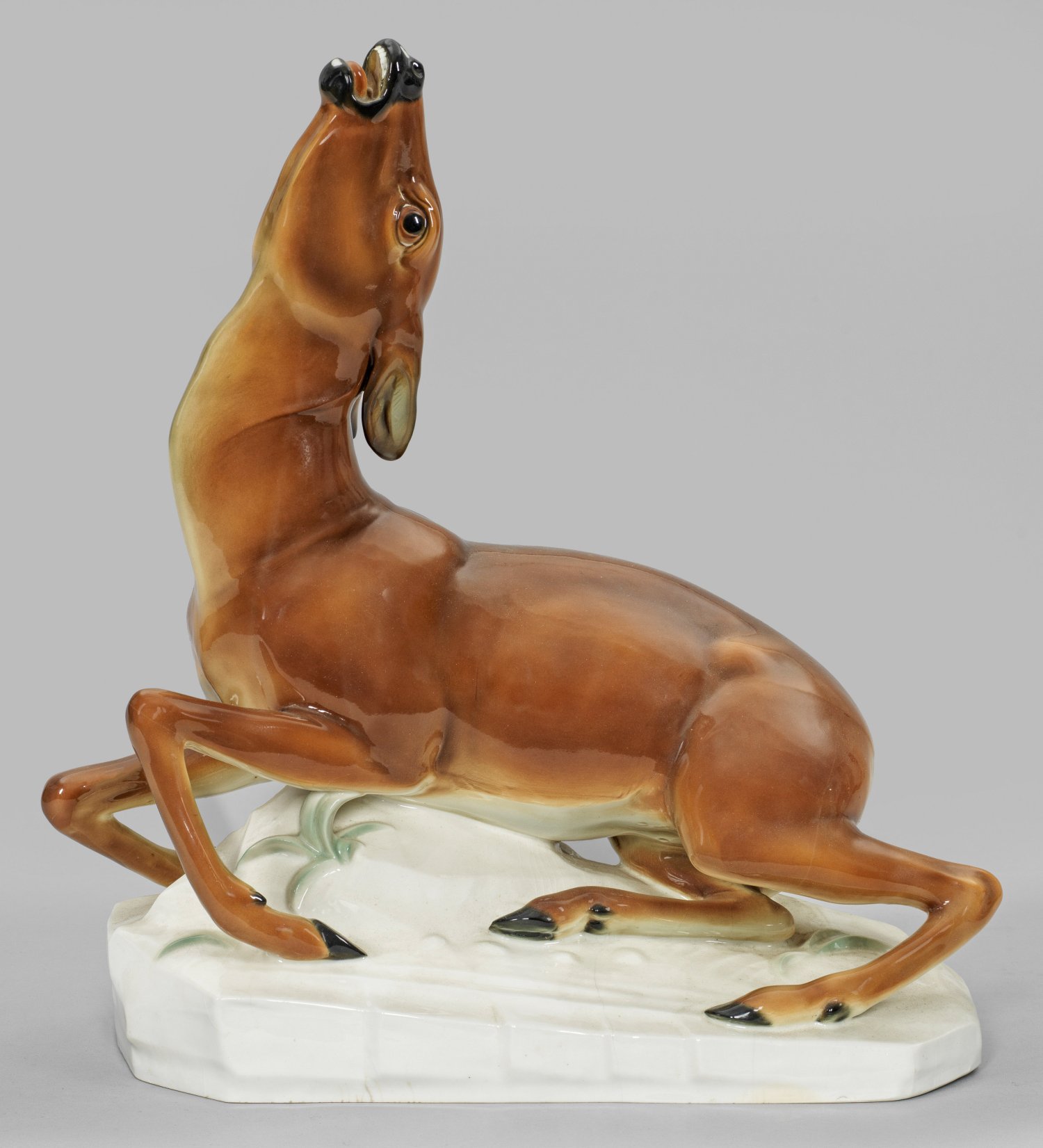 Auf stilisiertem Natursockel liegendes Reh mit aufgerichtetem Hals und Kopf sowie den zum Klagenschrei weit geöffnetem Äser. Polychrome Unterglasurmalerei. Entw. Arthur Storch, um 1922. Entw.-Monogr. mit Dat. (19)22. Modell-Nr. U. 1266. Glasurrisse. Eingepresste Manufaktur- und aufglasurblaue Fuchsmarke. H. 37,5 cm. L. 43 cm.