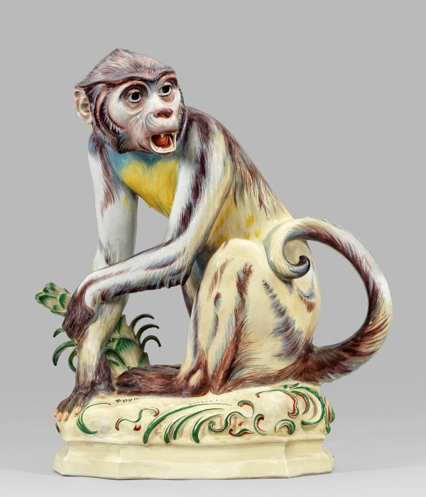 Auf bewachsenem Erdsockel sitzender Affe, seine Umwelt aufmerksam beobachtend. Farbkräftige, polychrome Aufglasurmalerei. Entw. Arthur Storch (1870 - 1947), 1921. Ligiertes Entw.-Monogr. "A.St.", Rest.; Manufakturmarke. H. 64 cm.