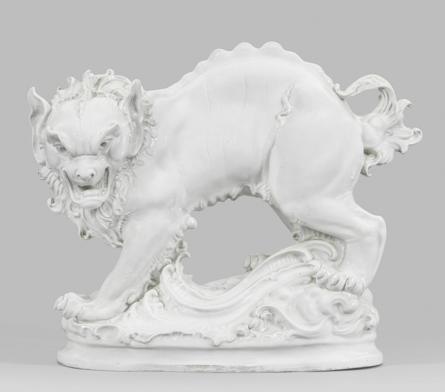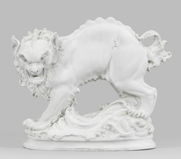 (auch bekannt als "Tiger"). Weißporzellan. Passig geschweifter, mit wellenartig aufsteigenden, reliefplastischen Blattrocaillen gestalteter Sockel. In Angriffsstellung stehendes Fabeltier mit buckelartig gewölbtem Rücken. Der Kopf mit dem weit geöffneten Maul, der zusammengekniffenen Stirn und den schimärisch gestalteten, aufgestellten Ohren ist frontal dem Betrachter zugewandt. Die wild kräuselnde Löwenmähne stark reliefplastisch gearbeitet. Rückseitig am Boden kriechende Eidechse. Entw. Arthur Storch (1870 - 1947), 1921. Ligiertes Entw.-Monogr. "A.St." mit Dat. 1921". Manufakturmarke. H. 59 cm. L. ca. 70 cm.