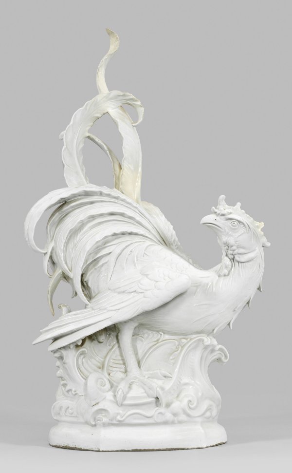 Weißporzellan. Auf passig geschweiftem Sockel mit aufsteigenden Rocaillen stehender Hahn mit aufgestelltem Gefieder. Entw. Arthur Storch (1870 - 1947), 1921. Ligiertes Entw.-Monogr. "A.St." mit Dat. "1921". Produktionsbedingte Brandrisse. Rest.; Manufakturmarke. H. 97 cm.