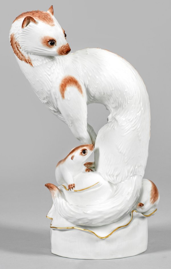 Auf gehöhtem, stilisierten Natursockel stehender, sich aufrichtender sowie umwendender Iltis. Der schlanke, langgestreckte Körper mit bogenförmig geschwungenem Rücken ist kraftvoll nach rechts eingedreht. Leicht reliefierte Fellzeichnung. Unterhalb die zwei schleichenden Iltis-Jungen. Sparsam akzentuierte, polychrome Malerei in verschiedenen Brauntönen mit Goldkonturierung. Entw. Max Esser, 1926. Modell-Nr. 78708. Schwertermarke. H. 37 cm.