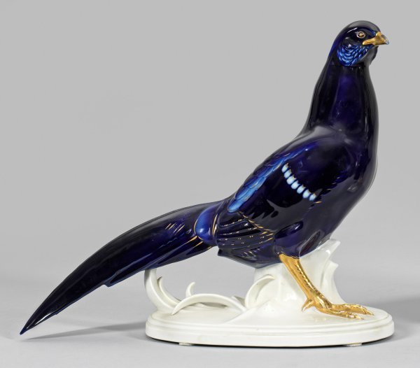Auf ovaler, profilierter Sockelplinthe stehender Fasan mit leicht reliefiertem Federkleid. Entw. Arthur Storch. Kobaltblaue Unterglasurmalerei mit goldstaffiertem Schnabel, Augen und Krallen. Entw. Arthur Storch. Entw.-Monogr.; Minim. rest.; Manufakturmarke. H. 43 cm.