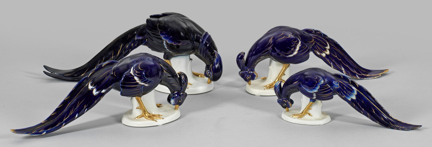 A collection of four Thuringian Art Deco porcelain figures of common pheasants painted in underglazed cobalt-blue and gold. Manufacturer's mark.