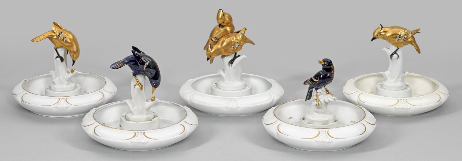 Runde, gemuldete Schale mit C-Schwüngen und Rosenstraußreliefs. Mittig stellbare Vogelfiguren bzw. -gruppe über Rundsockel als Steckschaleneinsatz mit Darstellung von heimischen Singvögeln, u.a. Haubenmeisen, auf Baumstamm sitzend. Kobaltblaue Unterglasur- und Goldmalerei, schwarz akzentuiert. Entw. Arthur Storch, um 1928. Entw.-Monogr.; Teilw. unw. best./rest.; Manufakturmarken. Figuren-H. 20 cm - 23 cm. Schalen-D.- 25,5 cm.