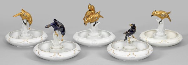 A collection of five large Thuringian Art Deco porcelain flower bowls with bird figures painted in underglazed cobalt-blue and gold as table decoration. Partly insignificantly chipped/restored. Manufacturer's mark.